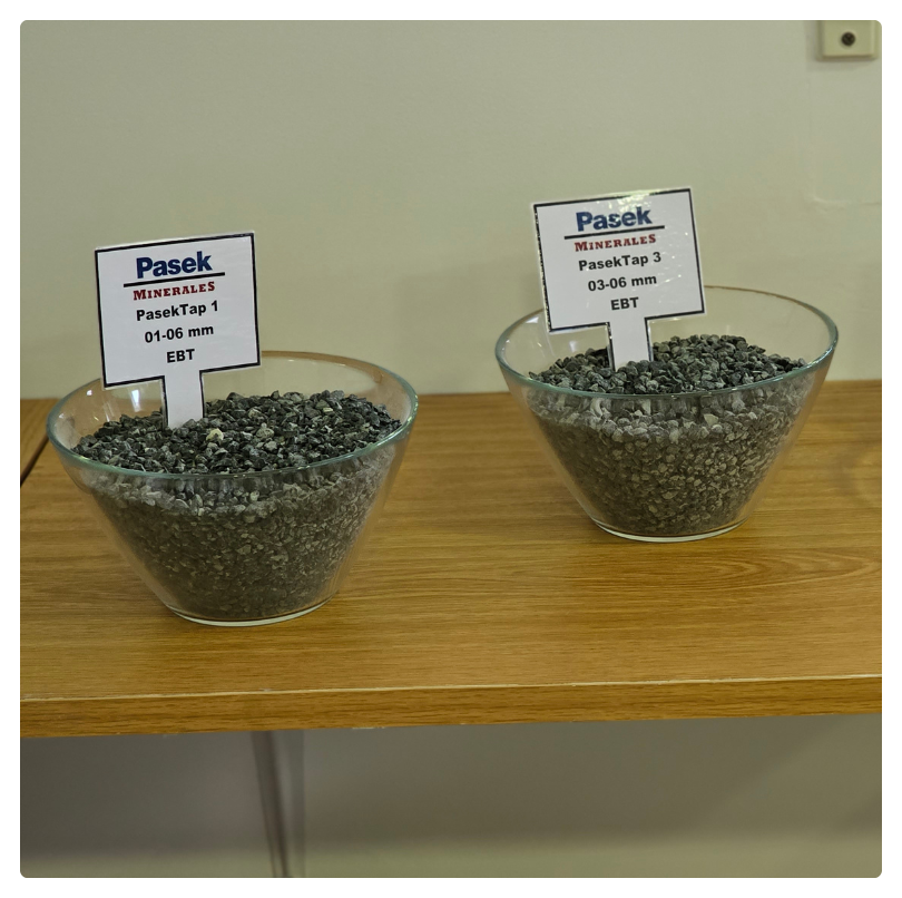 - Granulometrías optimizadas: nuestros productos principales, PasekTAP 1 (1–6 mm) y PasekTAP 3 (3–6 mm), están disponibles en versión estándar y calcinada.